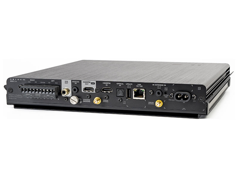 Il design salvaspazio dell’MRX SLM lo rende perfetto per installazioni dove ogni centimetro conta. Grazie alle sue dimensioni ridotte (27,9 x 3,8 x 27,9 cm) può essere posizionato dietro al televisore, in un mobile o in un media box a parete, senza sacrificare le prestazioni. La finitura nera elegante si integra con armonia in ogni ambiente, mentre la possibilità di montaggio a rack con staffe opzionali ne amplia la versatilità d’installazione.